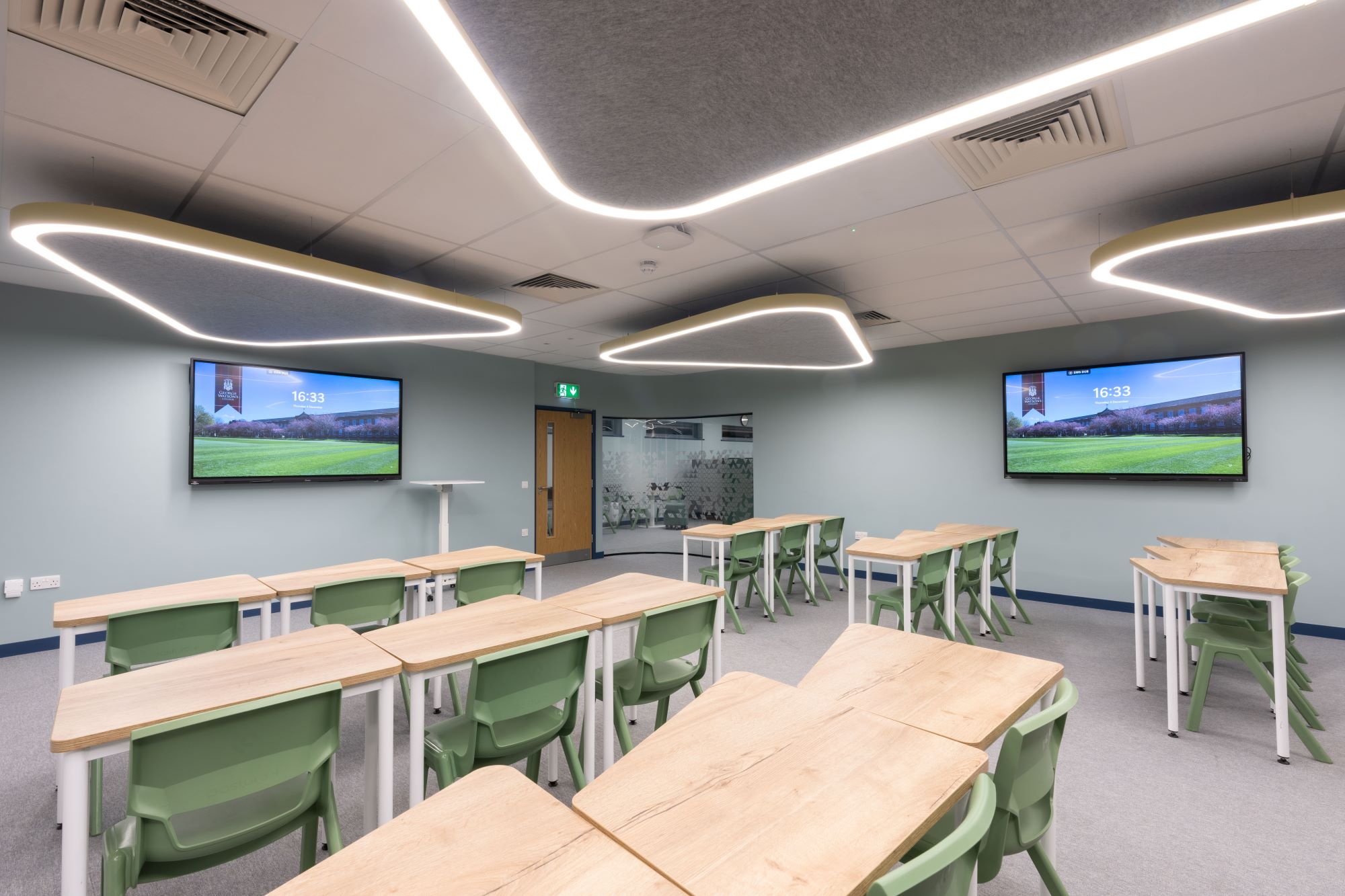 The finished space is an open-plan learning hub with two classrooms, offering good visibility and encouraging shared use. Floor levels were raised to remove steps into the space, making it more accessible for everyone. A number of structural pillars that could not be moved were carefully built into the partition layout so they didn’t block views or interrupt the flow. The final design feels open, flexible and clearly part of the wider school, supporting collaboration and everyday use.